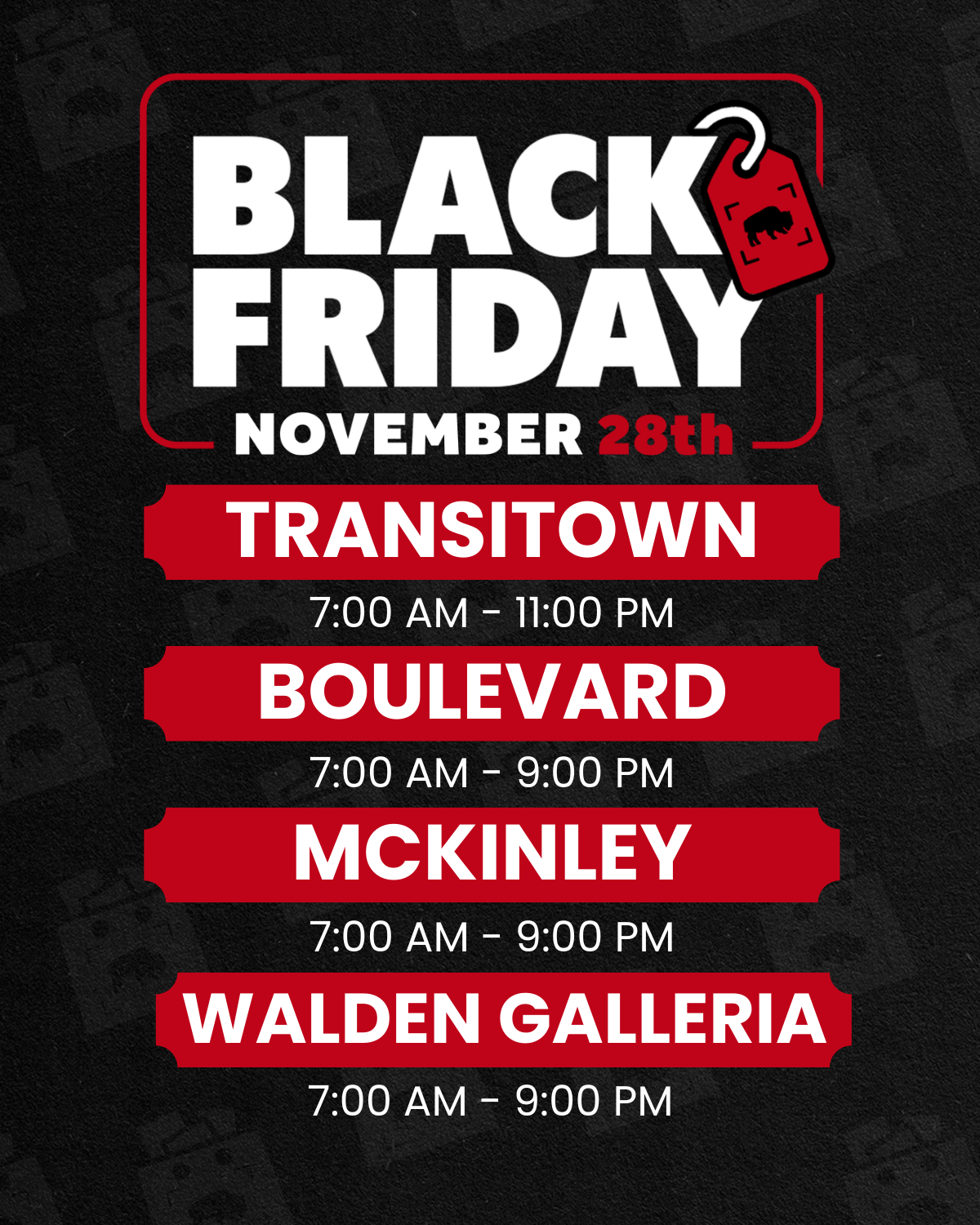 Black Friday is happening in-store only at all four BFLO locations.