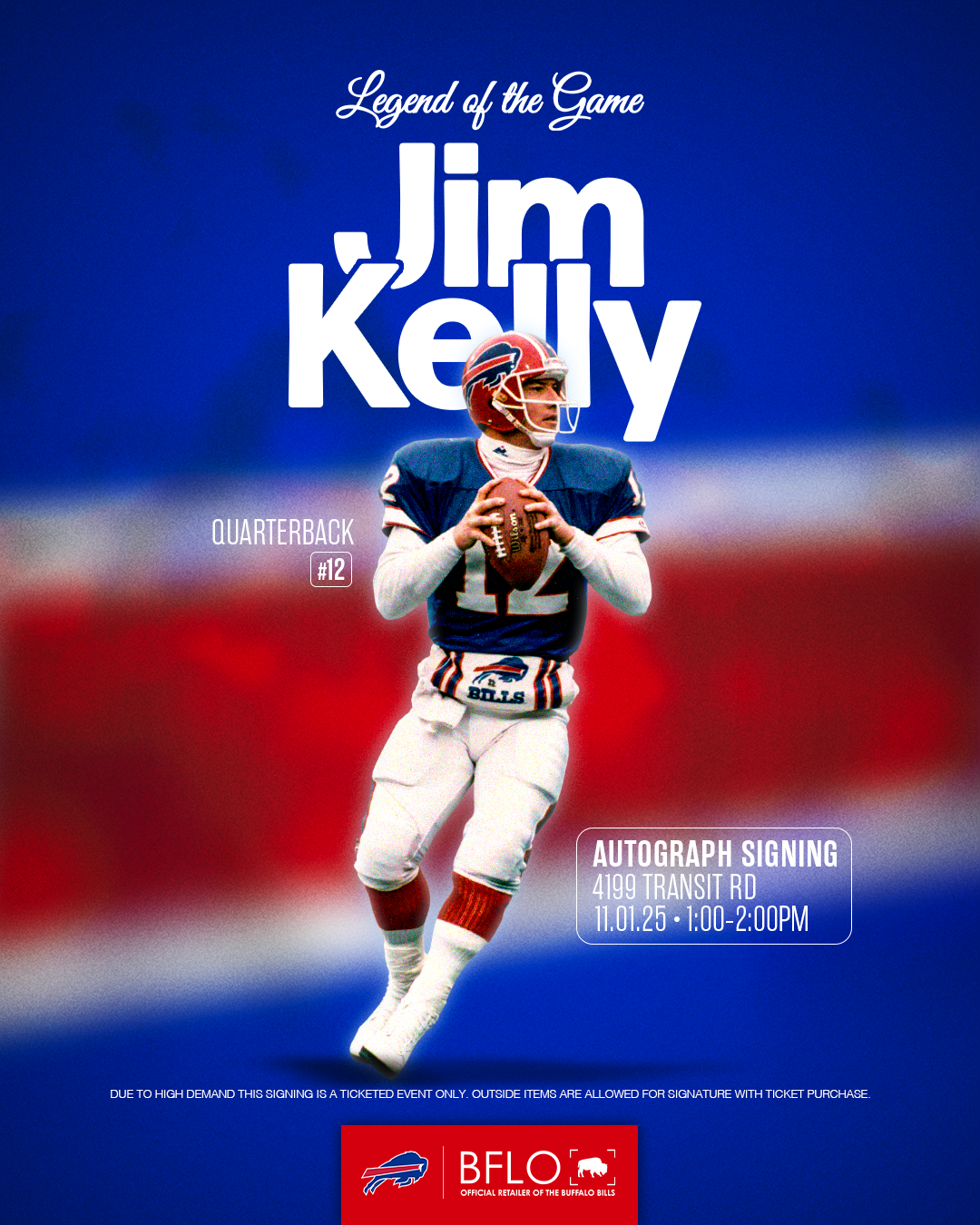 Join us for an unforgettable afternoon with Hall of Famer Jim Kelly at The BFLO Store! Kelly is this weeks Buffalo Bills Legend of the Game against Kansas City. This is your chance to meet one of the greatest to ever wear the red, white, and blue, right here in Buffalo. Fans can get up close, grab an autograph, and snap a photo with the Bills icon himself as we celebrate Buffalo football in true BFLO style.